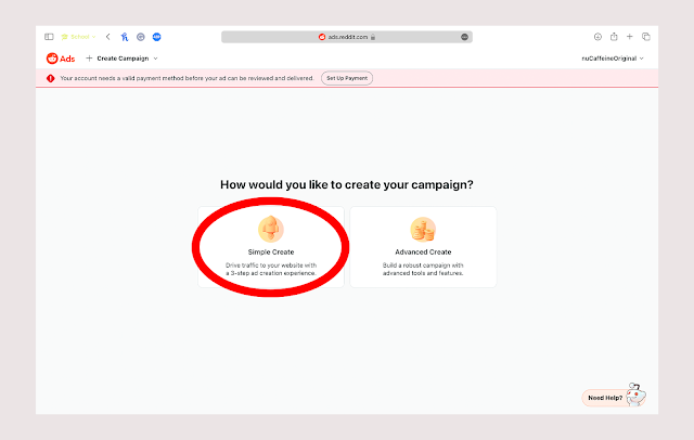 Once your account is set up, you can start advertising! Reddit has two types of campaigns you can choose from: "Simple Create" and "Advanced Create." Simple Create is great for a quick and straightforward ad campaign with some customization options, but definitely more streamlined. On the other hand, Advanced Create would be more suitable for complex and highly targeted campaigns. Advanced Create allows you to really hone in the target demographic as well as control your budget and even ad format choices. However, for purposes of this class, we'll explore what Simple Create looks like.